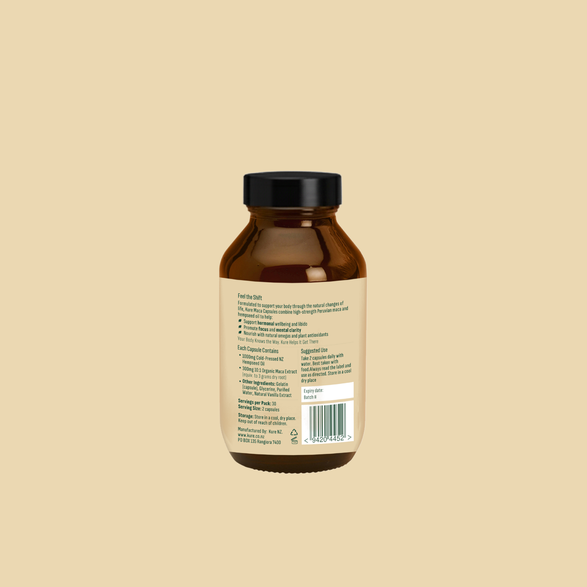 Each capsule provides 1000mg Hemp Seed Oil and 300mg Maca Extract, supplying fatty acids and adaptogenic nutrients for hormonal and nervous system support.