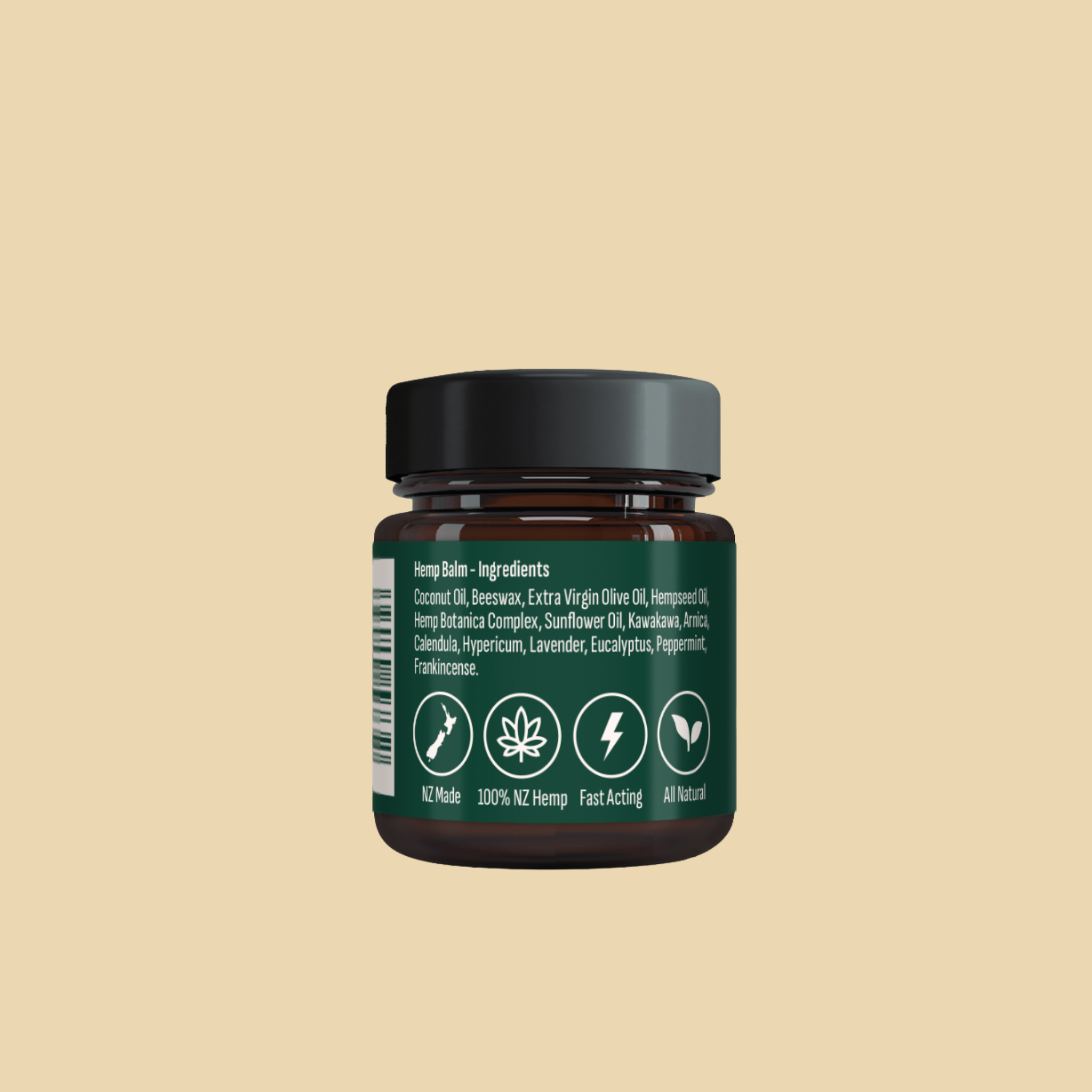 Coconut Oil, Beeswax, Extra Virgin Olive Oil, Hempseed Oil, Hemp Botanica Complex, Sunflower Oil, Kawakawa, Calendula, Arnica, Hypericum, Essential Oils (Lavender, Eucalyptus, Peppermint, Frankincense).